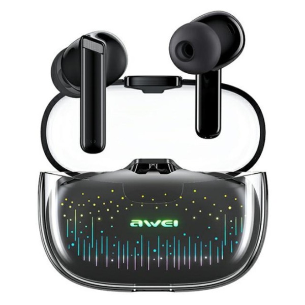 AWEI T52 TWS са безжични слушалки за в ушите, които използват най-новата технология Bluetooth 5.3 за стабилен и ефективен пренос на звука, както и интелигентна система за потискане на шума и отлично качество на звука. Слушалките имат футуристичен дизайн, който предлага поглъщащо визуално преживяване. Прозрачната капсула е оборудвана със светлинни ефекти "Starlight RGB". Благодарение на отличните наноматериали, слушалките разполагат с водоустойчива защита на ниво IPX4. Отсега нататък не трябва да се страхувате от дъжд и пот при използване. Просторната докинг станция, до 300 mAh, осигурява до 8 часа работа с едно зареждане.