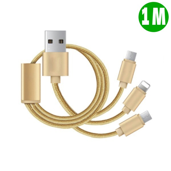 Кабелът за бързо зареждане 3 в 1 в златен цвят е оборудван с три входа: USB-C, Lightning и Micro USB, които го правят съвместим с различни устройства, включително смартфони, таблети, игрови конзоли и други устройства. Той е подходящ за зареждане на всички мобилни устройства и го прави перфектен за употреба у дома, в офиса или на път.