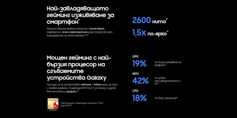 Samsung Galaxy Z Fold6 е оборудван с най-новия процесор Snapdragon 8 Gen 3 Mobile Platform for Galaxy, който осигурява изключителна производителност при всякакви задачи. С осемядрен CPU и графичен процесор Adreno 750 (с тактова честота от 1 GHz), устройството се справя с тежки игри, многозадачност и работа с приложения без забавяне.